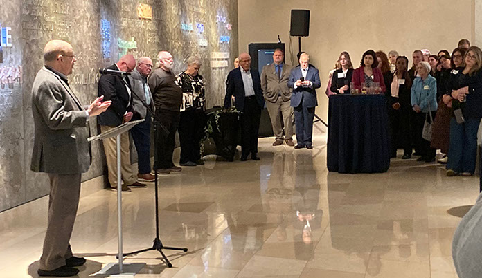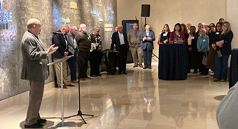 Ted (left) speaking to the assembled at the opening reception.