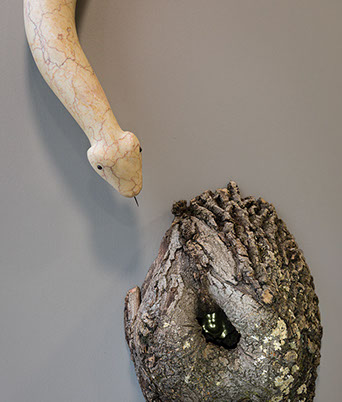 Crema valencia marble, white oak, tar, steel, glass taxidermist eyes, thorn, Ash burl, soil, cast bronze, lacquer. The assemblage occupies about an 8’ vertical area, and the Ash burl is 22” h. and projects about 12” from the wall, placed at about chest height. Collection of Gordon College, Wenham MA