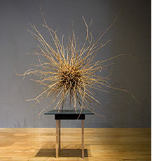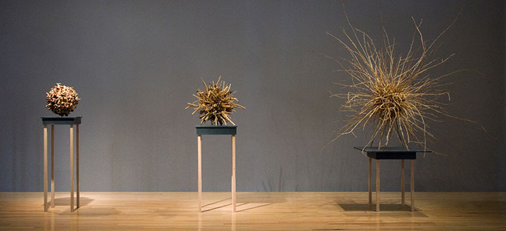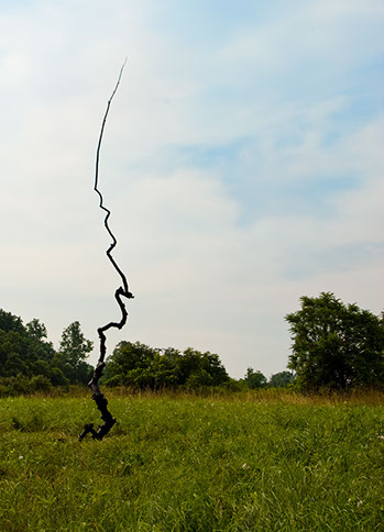 With the exception of Beech Float, all of the pieces are constructed from apple limbs, which were harvested, dried, joined, and shaped. The original forms of the limbs were the result of pruning, as well as each tree’s responses to wind, weight, and light. In the assemblies, these innate characteristics are used for sculpturally expressive and evocative purposes. Some, like Straight Line to Heaven were coated with the industrial material commonly known as “truck bed liner”. In addition to providing color and texture, the coating makes the pieces weather proof. The piece Small Worlds won 1st place Sculpture in The Art of the State exhibit at the PA State Museum in 2010.