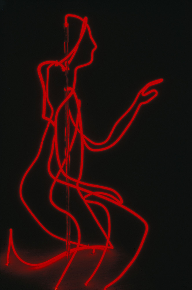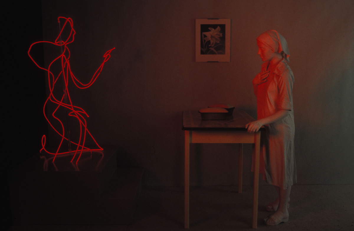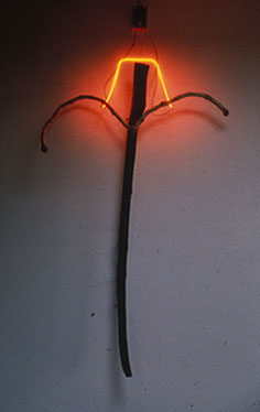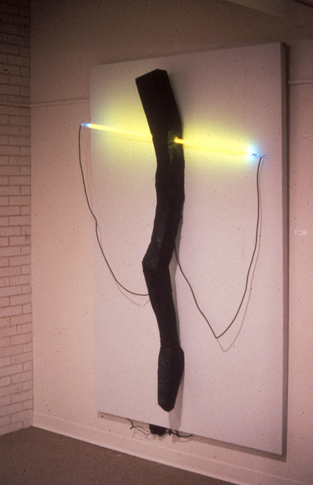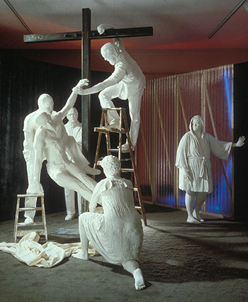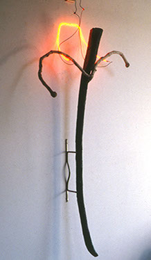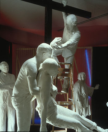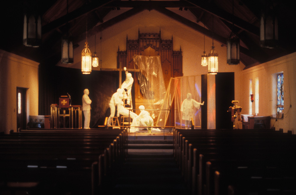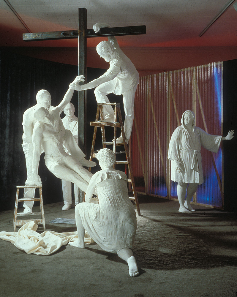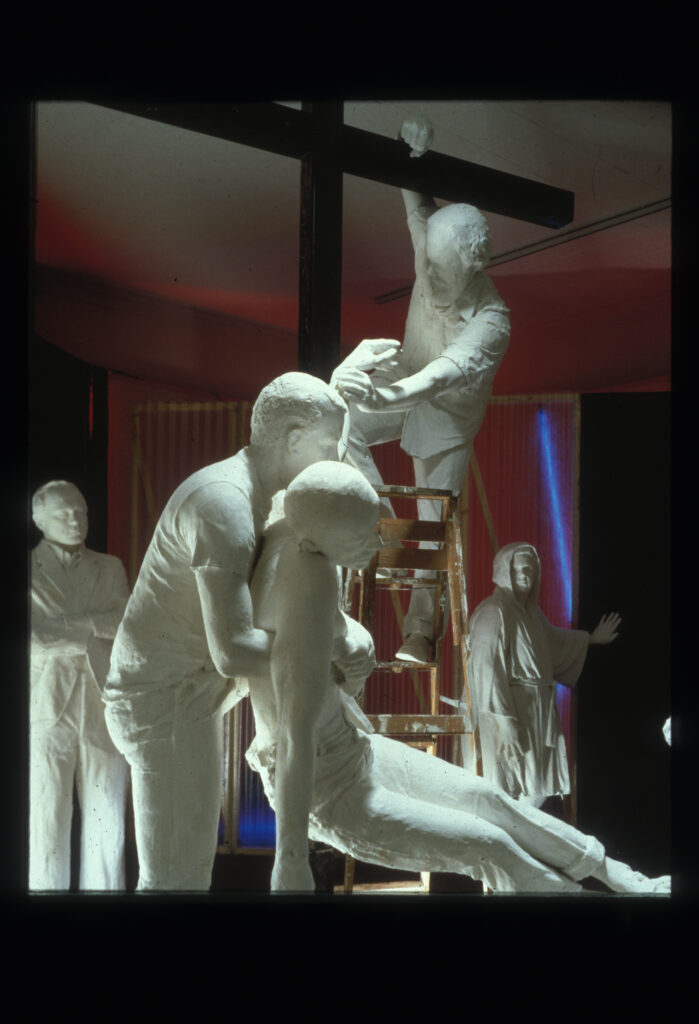Cast hydrocal, steel, wood, fiberglass, neon, cloth figure life size, cross 10′