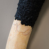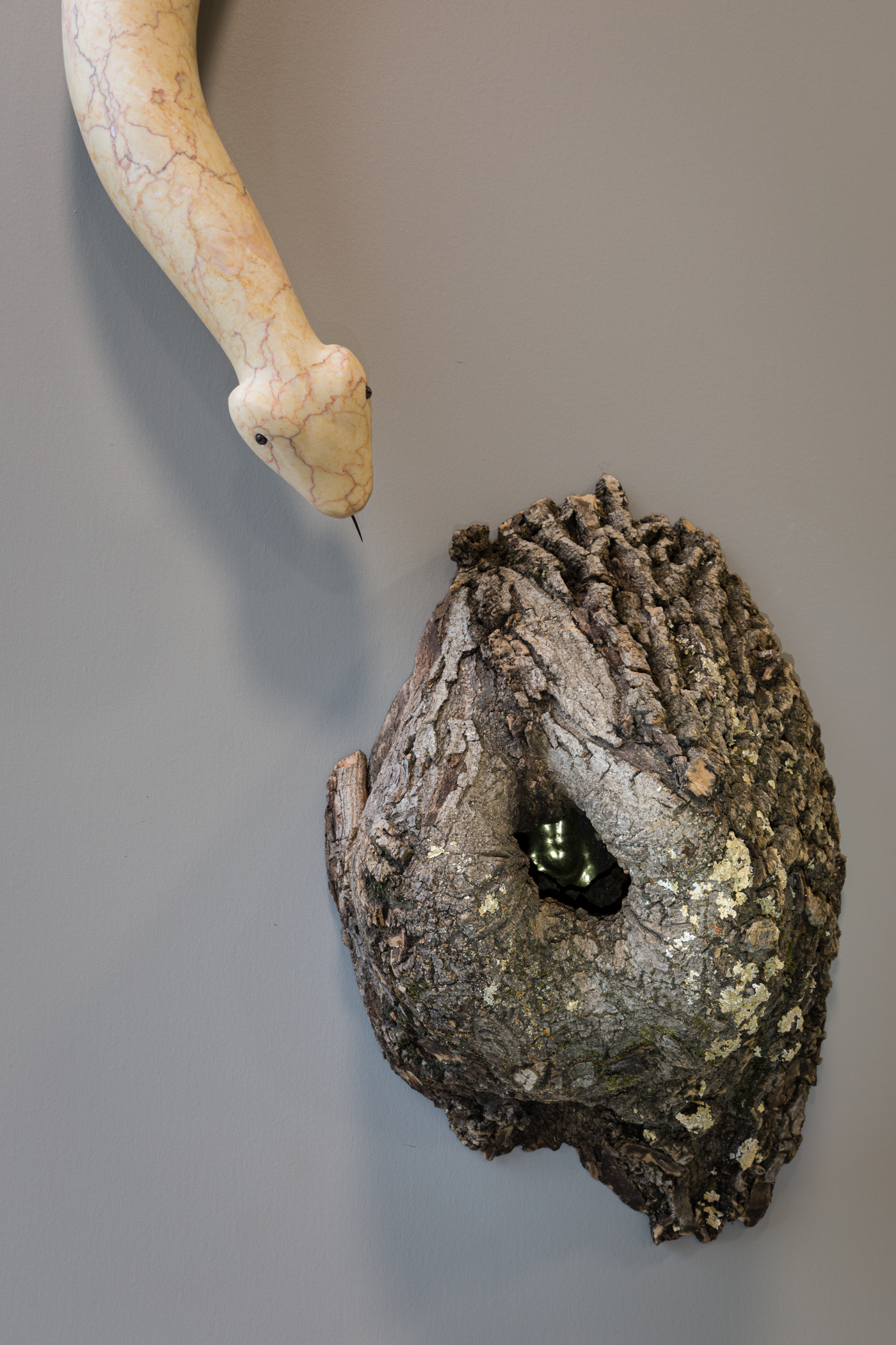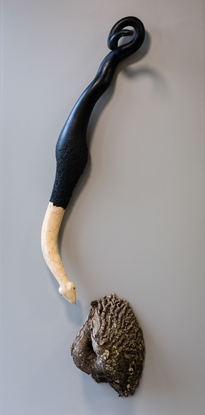 Crema valencia marble, white oak, tar, steel, glass taxidermist eyes, thorn, Ash burl, soil, cast bronze, lacquer. The assemblage occupies about an 8’ vertical area, and the Ash burl is 22” h. and projects about 12” from the wall, placed at about chest height. Collection of Gordon College, Wenham MA