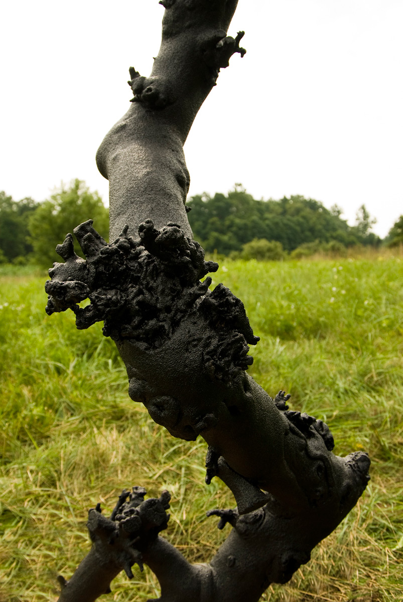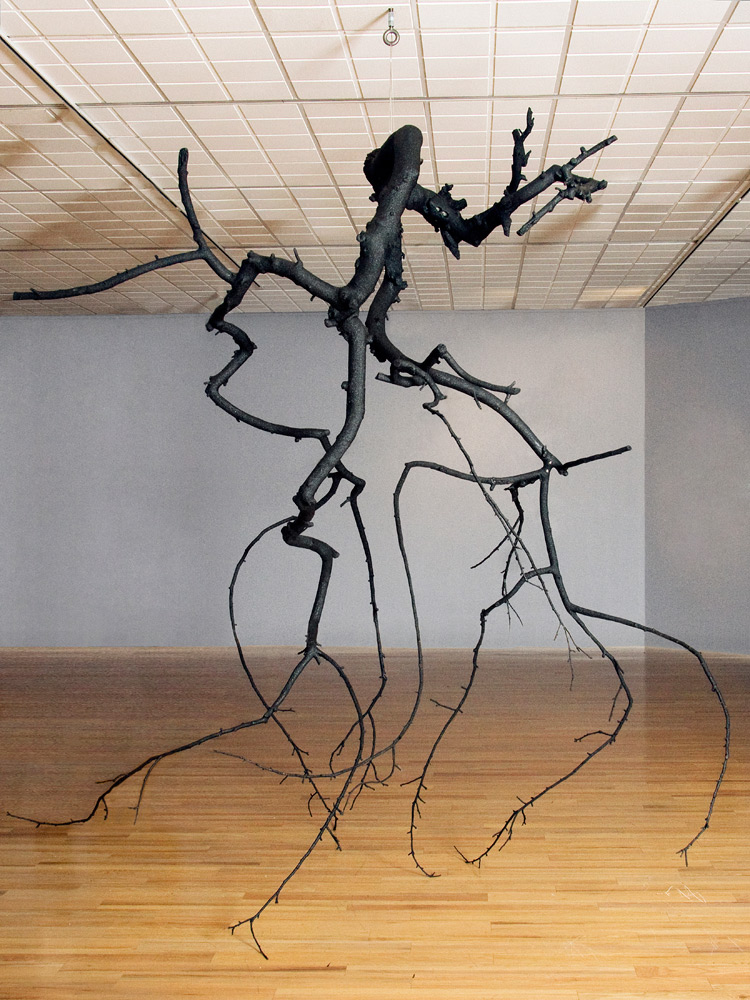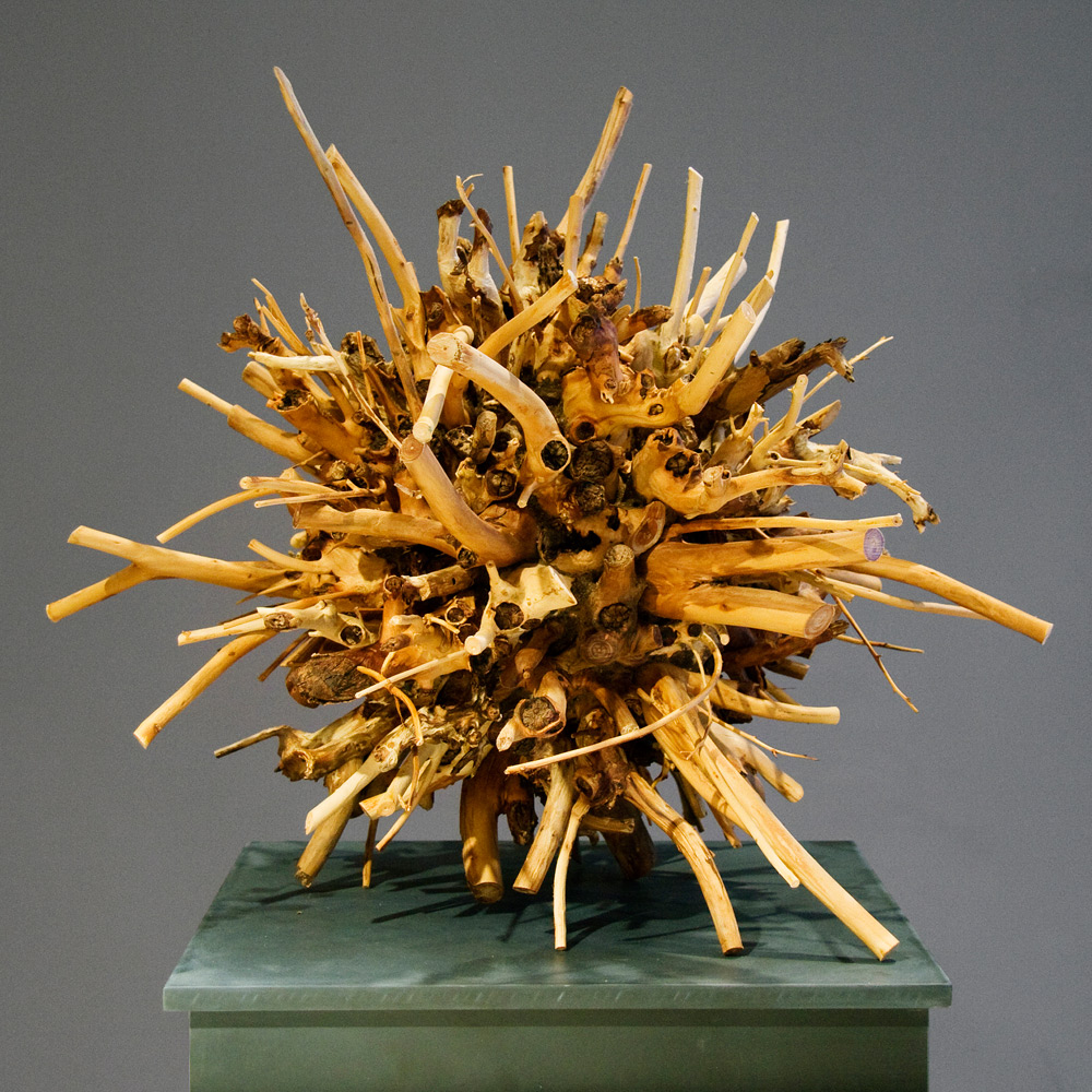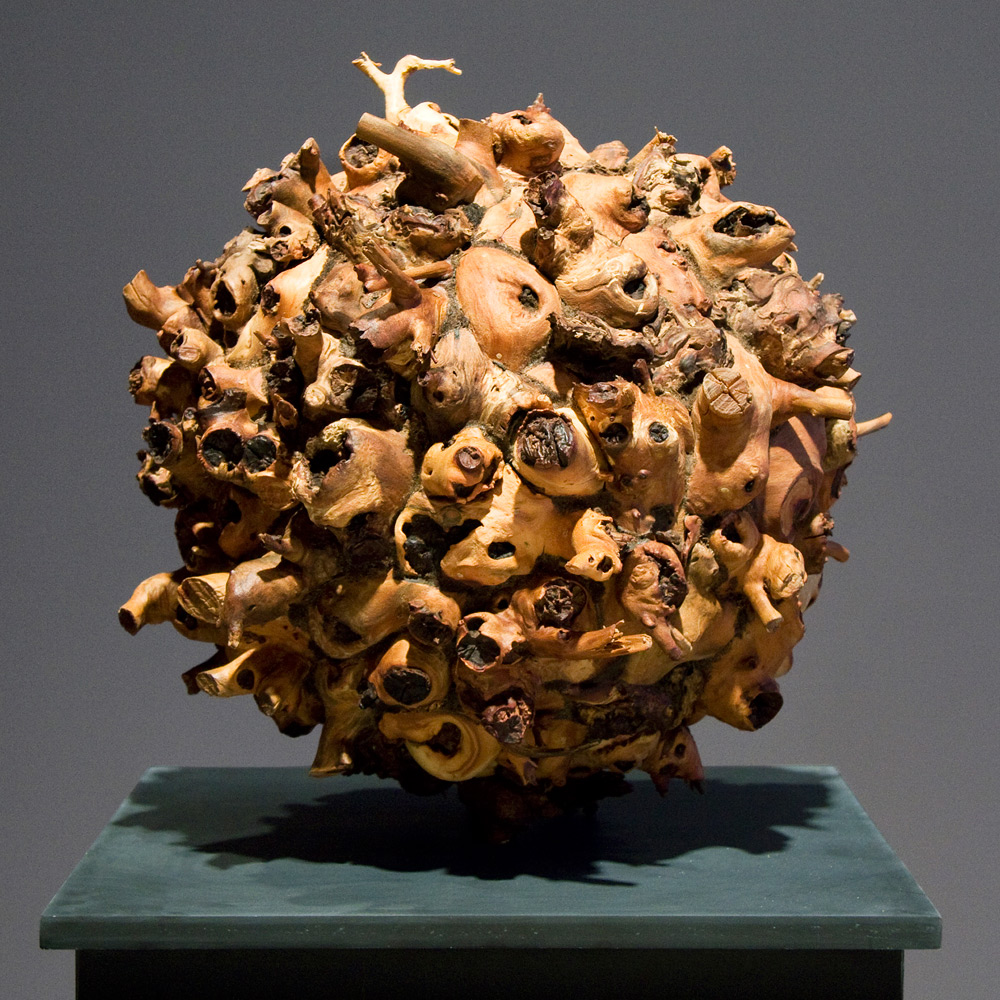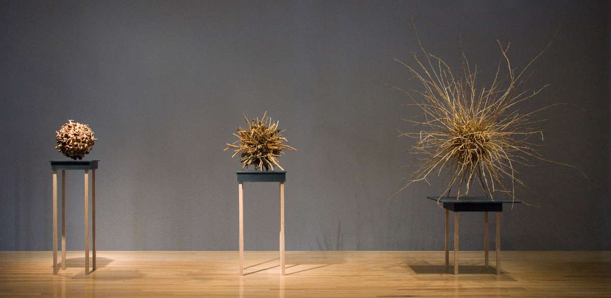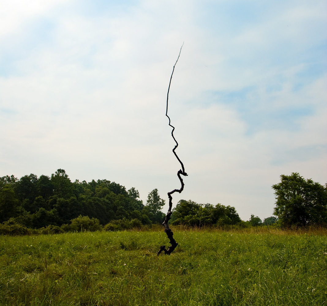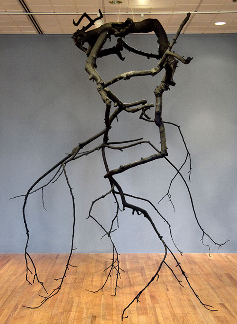 With the exception of Beech Float, all of the pieces are constructed from apple limbs, which were harvested, dried, joined, and shaped. The original forms of the limbs were the result of pruning, as well as each tree’s responses to wind, weight, and light. In the assemblies, these innate characteristics are used for sculpturally expressive and evocative purposes. Some, like Straight Line to Heaven were coated with the industrial material commonly known as “truck bed liner”. In addition to providing color and texture, the coating makes the pieces weather proof. The piece Small Worlds won 1st place Sculpture in The Art of the State exhibit at the PA State Museum in 2010.