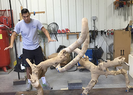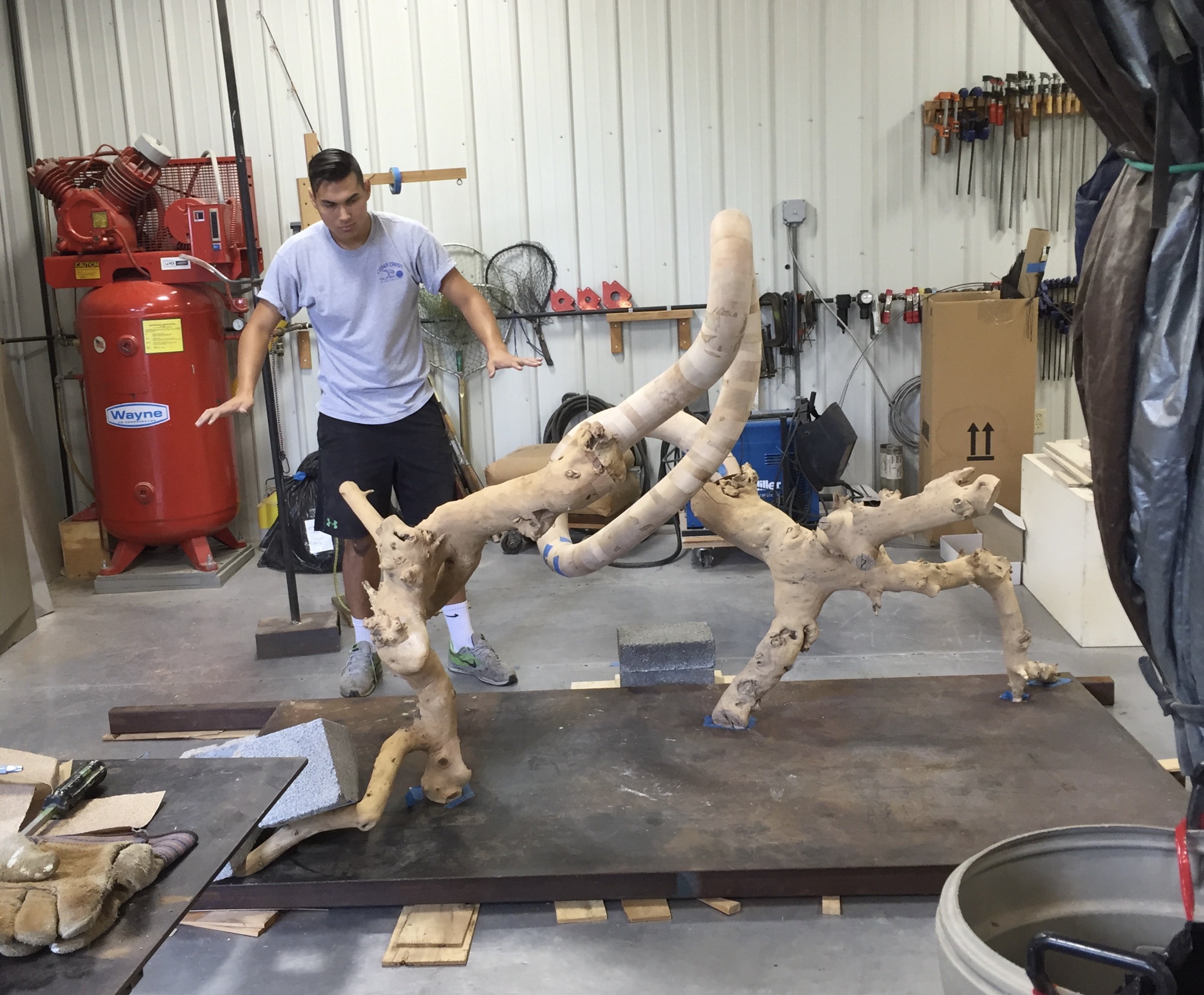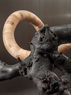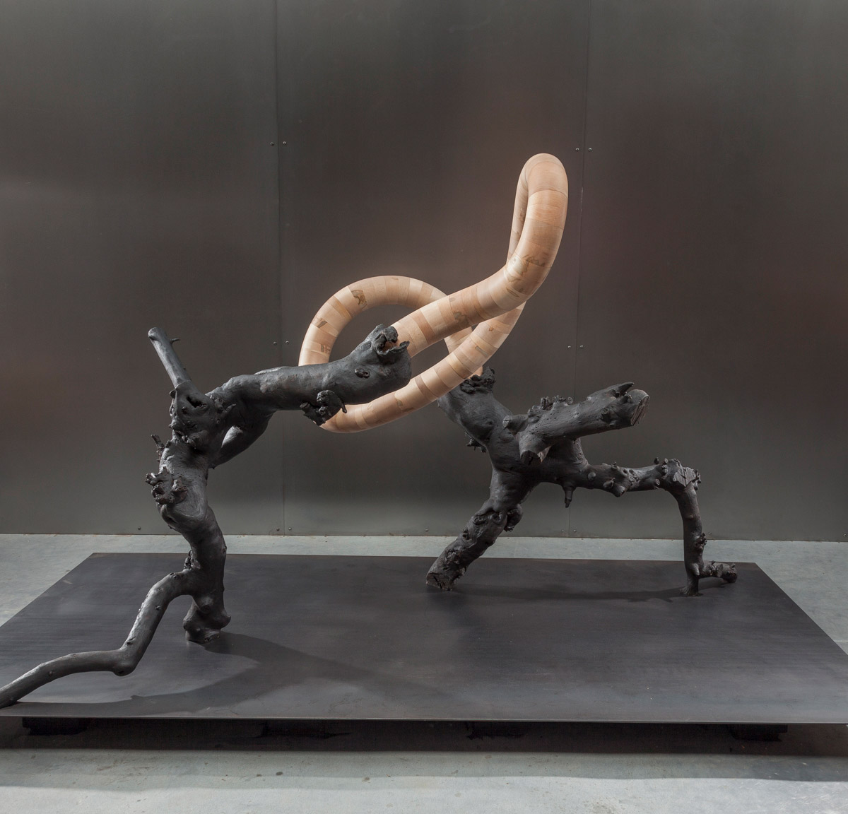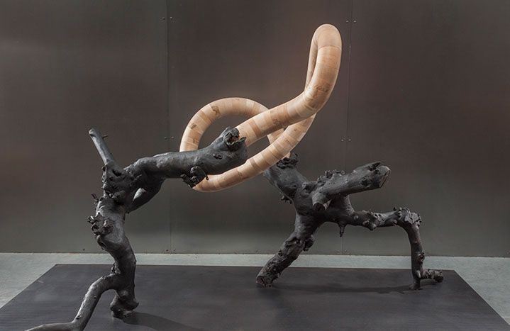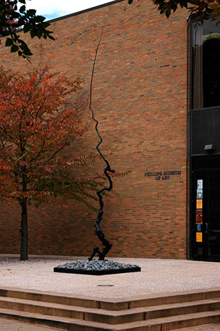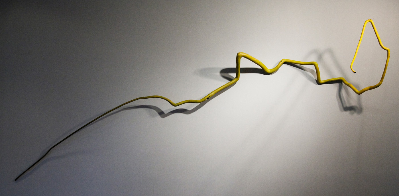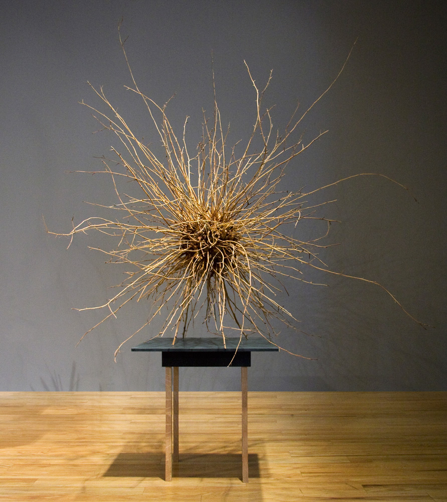 With the exception of Beech Float, all of the pieces are constructed from apple limbs, which were harvested, dried, joined, and shaped. The original forms of the limbs were the result of pruning, as well as each tree’s responses to wind, weight, and light. In the assemblies, these innate characteristics are used for sculpturally expressive and evocative purposes. Some, like Straight Line to Heaven were coated with the industrial material commonly known as “truck bed liner”. In addition to providing color and texture, the coating makes the pieces weather proof. The piece Small Worlds won 1st place Sculpture in The Art of the State exhibit at the PA State Museum in 2010.